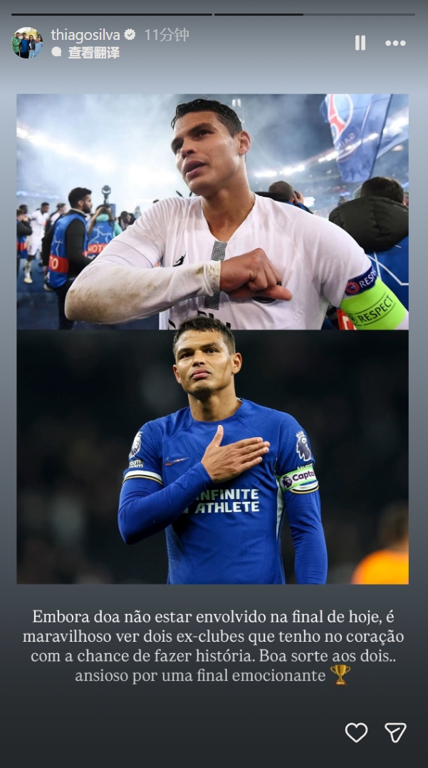 7月14日讯 在世俱杯决赛的比赛中,巴黎圣日耳曼对阵切尔西,曾效力于两队的巴西中卫蒂亚戈-席尔瓦社媒发文。