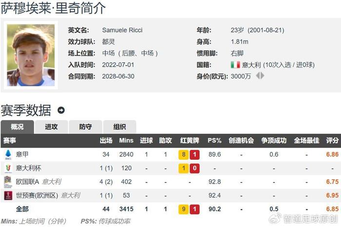 现年23岁的里奇,身高1.81米,右脚球员,主打后腰位置,与都灵的合同至2028年,德转身价3000万欧元,是都灵队内身价最高的球员。里奇上赛季一共出战了34场意甲的比赛,全部首发,荷甲出场2840分钟,贡献1球1助。